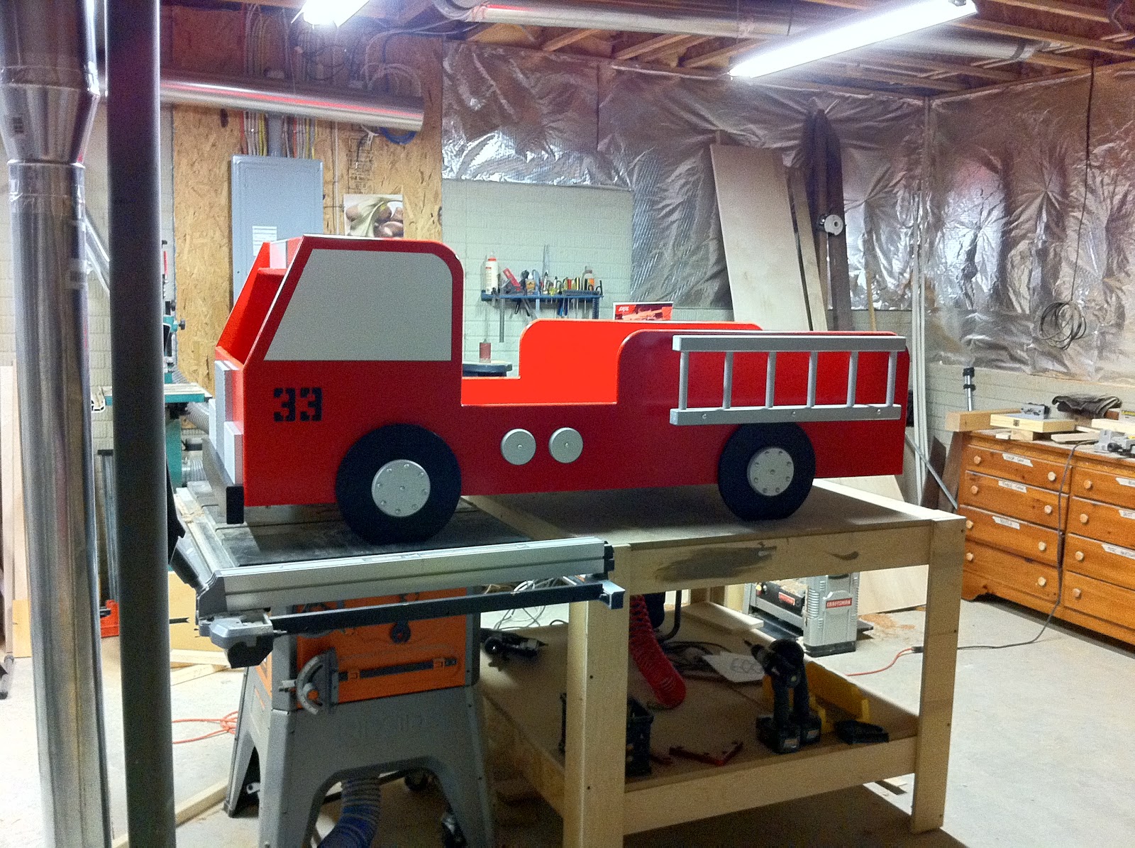 Well, I finished Drew's Christmas present just in time. Below you'll find the coolest (google it, you'll see) toddler fire truck bed in existence. He is probably too young to appreciate it, but my girls have assured me that its very cool. It has a toy box in the front, book holders on the side, and small nic/nac shelf on top. I had no plans for this, just winged it.